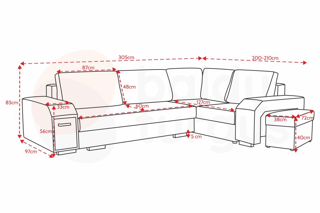 Išmatavimai: A: 85cm P: 305cm G: 200-210cm