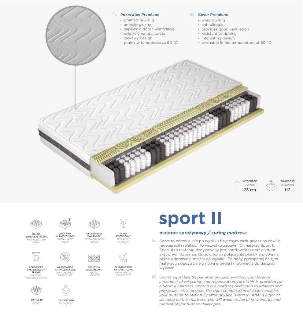 Sportas - sveikata, bet po fizinio krūvio nusipelnėte akimirkos poilsiui. Čiužinys SPORT-II su ortopedinėmis savybėmis, tinkamas žmonėms gyvenantiems aktyviai. Puikiai parinkti ir tarpusavyje derantys čiužinio komponentai, leis visiškai atsipalaiduoti po aktyvios veiklos ir įgauti energijos tolimesniems iššūkiams.
