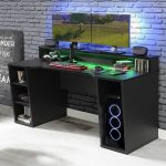 TEZAUR - kompiuteriniams žaidimams pritaikytas stalas. Platus, atsparaus paviršiaus stalviršis, leis sutalpinti du monitorius, o anga laidams - palaikyti tvarką. Stalas turi nuotolinio valdymo pultu veikiantį RGB apšvietimą ir pritaikytą erdvę stacionariam kompiuteriui.