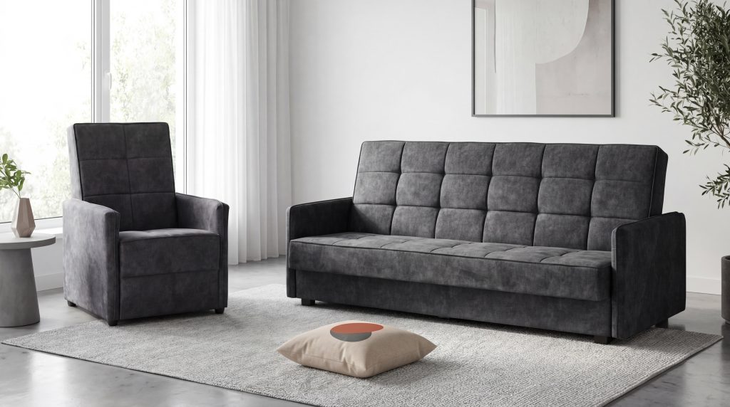 "Click-Clack"?"Click-Clack“ – keliama sėdima dalis tol, kol atsikabina lankstuose esantys specialūs kabliukai ir leidžia išskleisti sofą į miegamą padėtį.